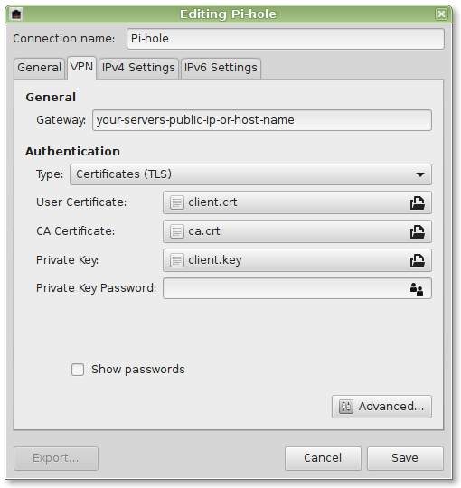 Now that the server is configured, you'll want to connect some clients so you can make use of your Pi-hole wherever you are. Doing so requires the use of a certificate. You generate these and the resulting .ovpn file by running the installer and choosing 1) Add a new user for each client that will connect to the VPN.